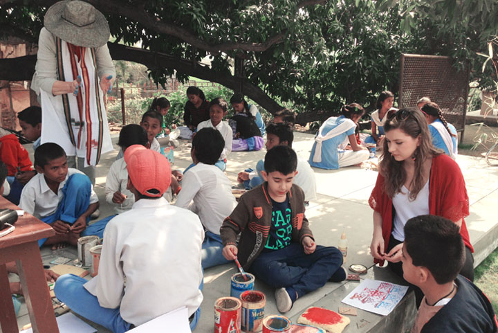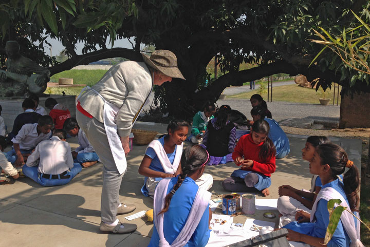 Textile Designer Trish Bygott works with the girls of Ichol village, showing them embroidery techniques