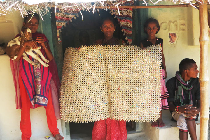 Helping to sell mats made by villagers from waste 'Pan Masala' plastic packets